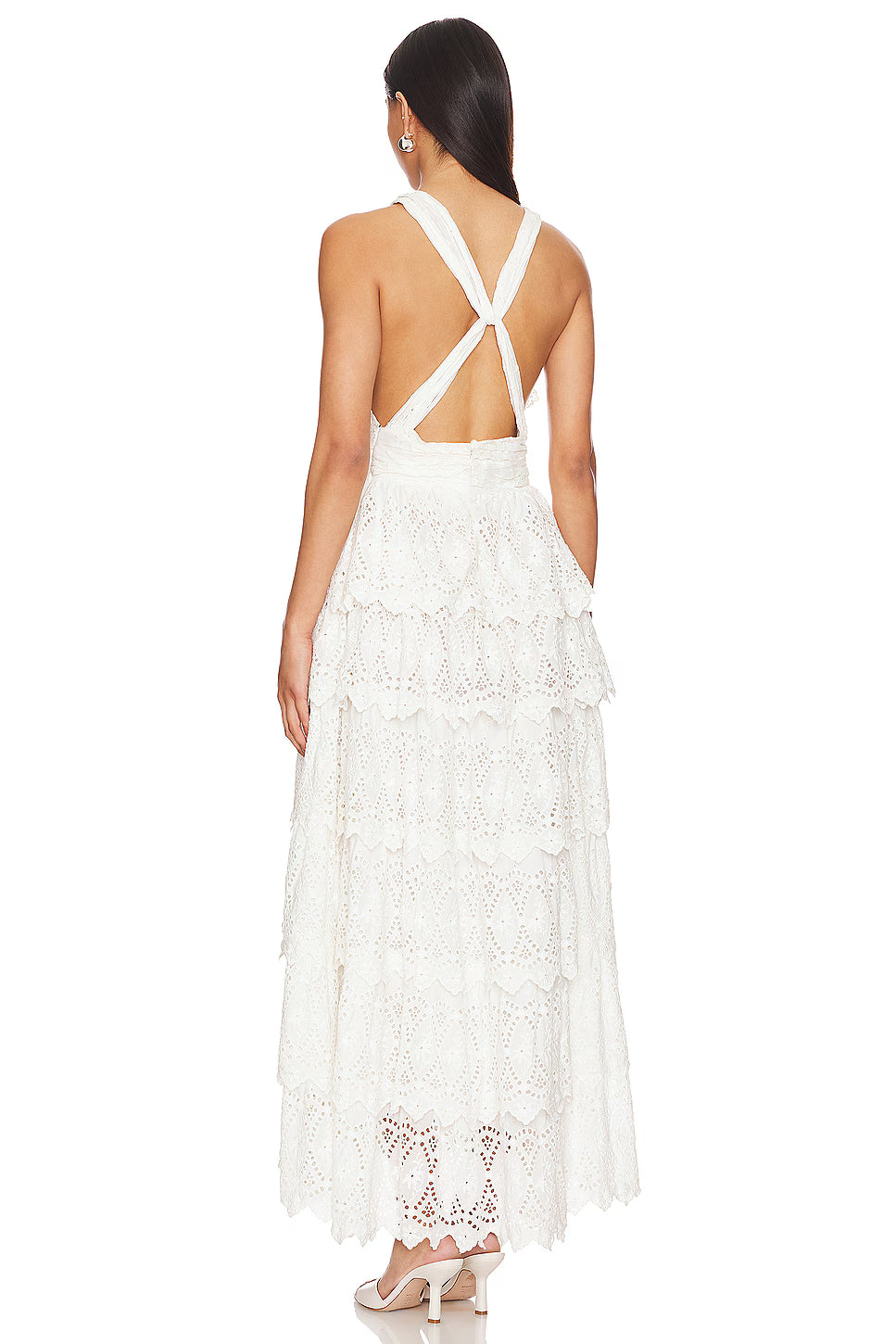 A romantic white maxi with beautiful detail and an effortless feel. The Nevis Dress is crafted from airy cotton voile with eyelet throughout, featuring a halter neckline with a scalloped edge and a softly tiered skirt that moves beautifully as you walk.