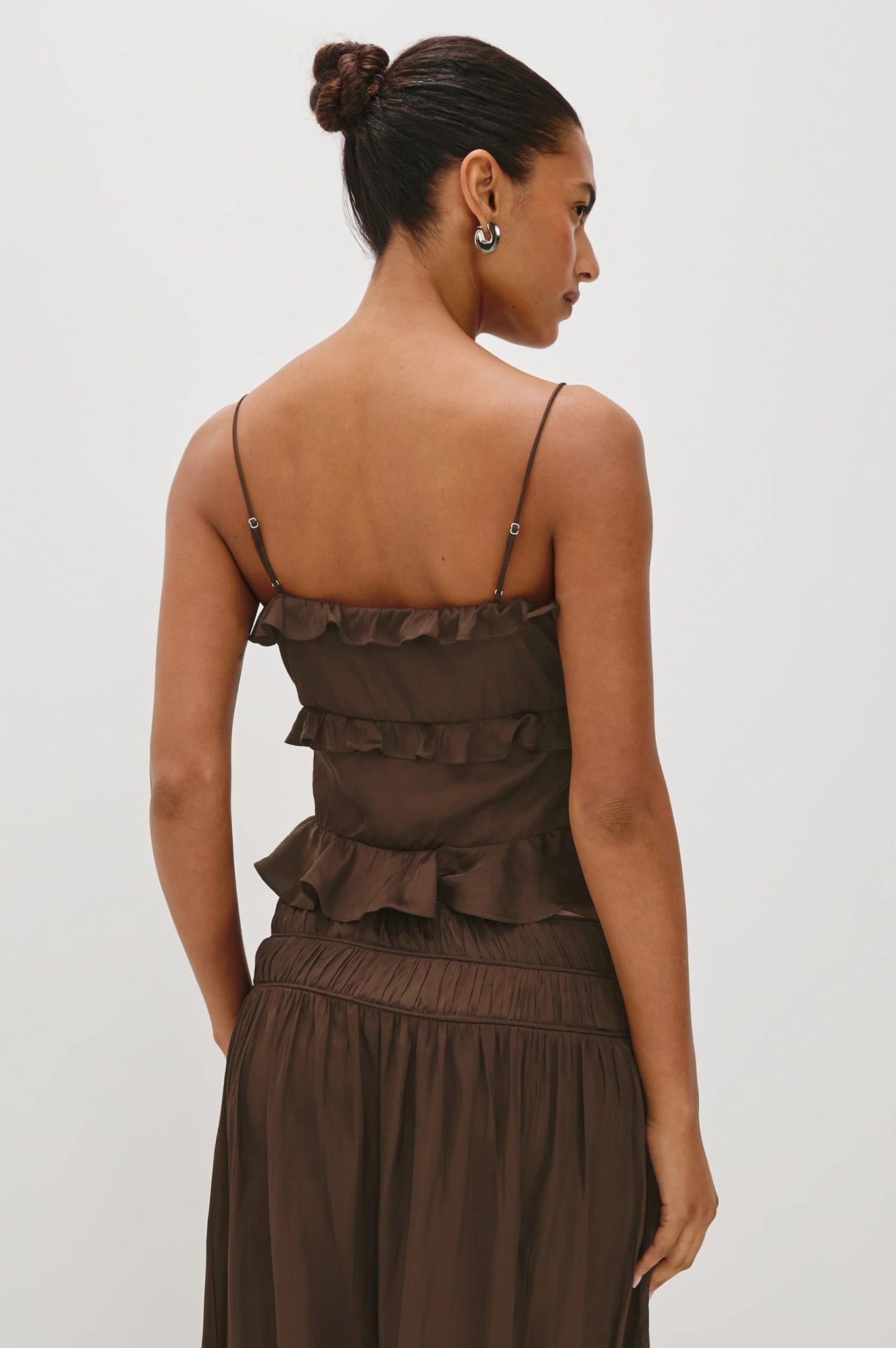 Crafted from silky crinkle satin, the Ortona Top has tiered ruffles and dainty tie closures. A side zipper and adjustable straps ensure the perfect fit.