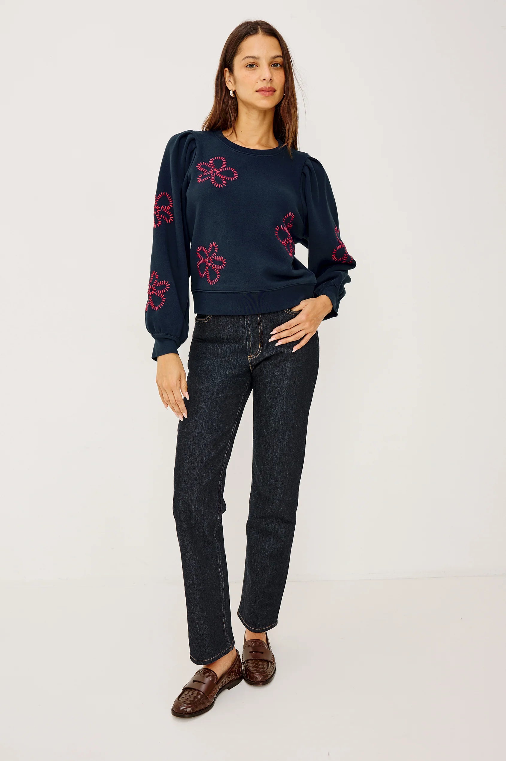Feminine ease for every day, the Tiffany sweatshirt features contrast-stitch floral motifs in soft French terry, with long puff sleeves and a relaxed, boxy fit.