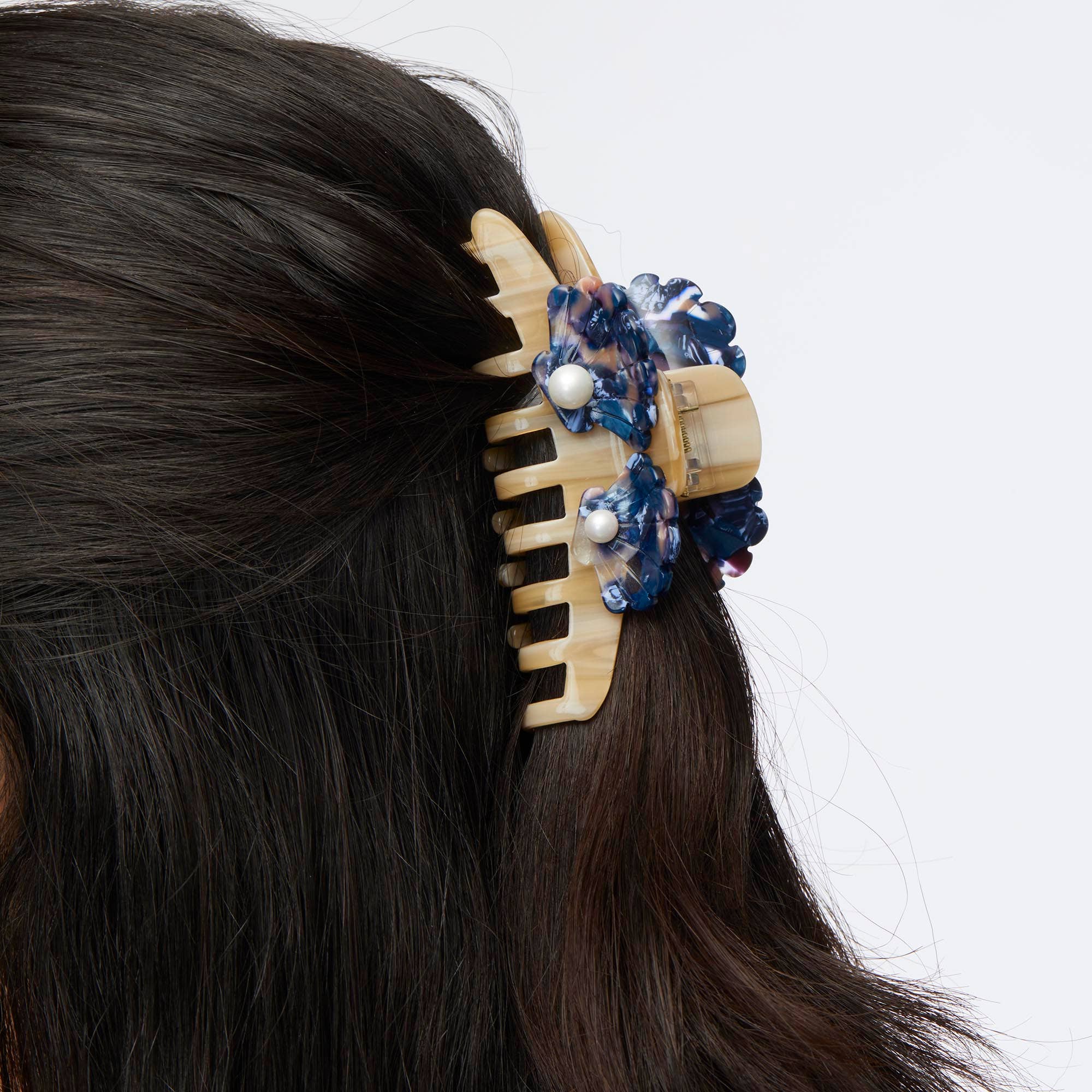 This seaside-inspired twist on Lele Sadoughi's popular Petunia claw clip features a sandy acetate base adorned with blue, hand-swirled shell charms. Each charm is accented with a hand-set faux pearl center. Measuring 4" by 1½", it comes tucked inside a striped resealable pouch for safekeeping.