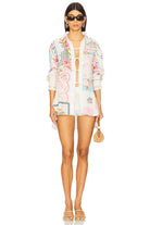 This oversized shirt showcases tie-bow front closures and a delicate patchwork-inspired floral print, adding a handcrafted charm to its relaxed design. With a longline silhouette, curved hem, and long sleeves, it’s perfect for layering or wearing on its own. A versatile piece that celebrates the beauty of intricate artistry while offering comfort and style.