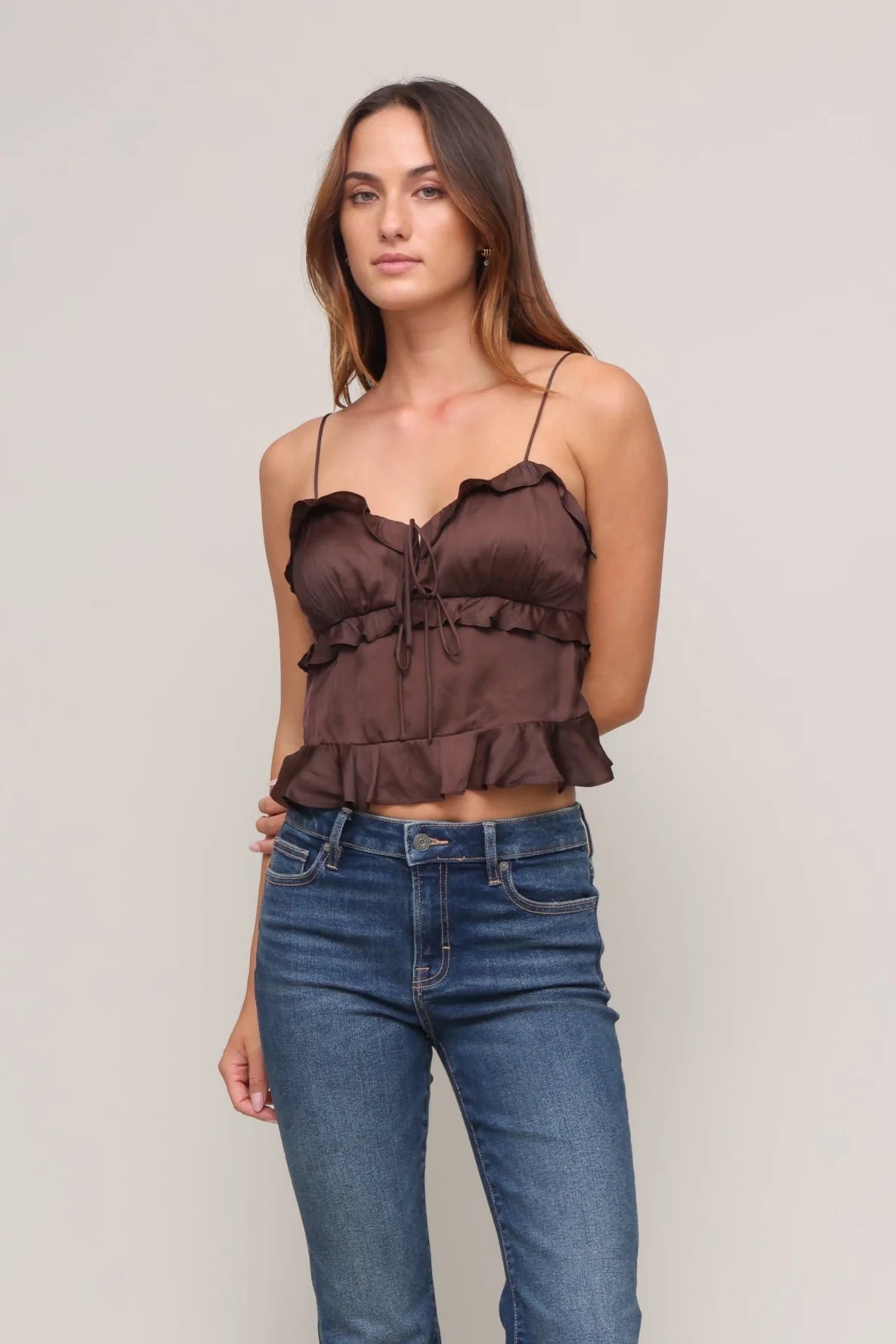 Crafted from silky crinkle satin, the Ortona Top has tiered ruffles and dainty tie closures. A side zipper and adjustable straps ensure the perfect fit.