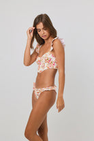 The Cheeky Ruffle Bottom in Peach Floral is the flirty, feminine swim essential your summer wardrobe needs. Designed with a hand-drawn in-house floral print, this low-rise bikini bottom features delicate ruffle detailing and a cheeky backside for a playful finish. Crafted from 80% recycled nylon and 20% spandex with built-in UPF 50 sun protection, it’s as functional as it is flattering. Complete the look with the matching Corset Ruffle Top and Peach Floral Short Swim Sarong for the ultimate flirty set.